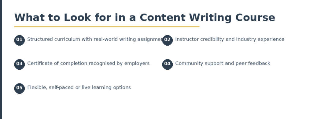 Second, I look at the curriculum. A good content writer course should cover writing fundamentals, SEO basics, audience research, and real editing exercises. If it only focuses on one area, that is a red flag for me.