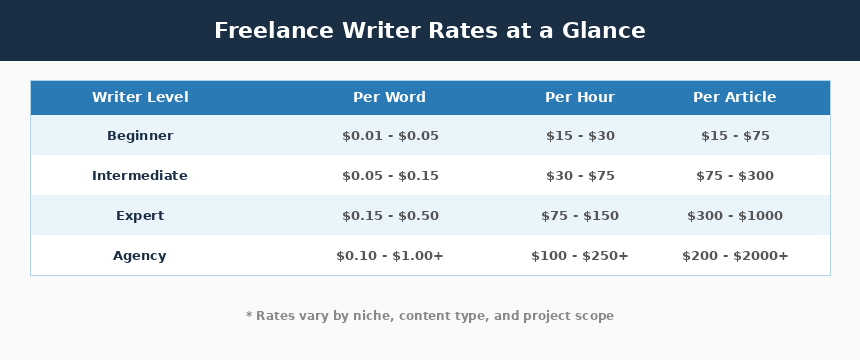 Start by setting an income goal and working backwards from there. If you are new to freelancing, $0.05 to $0.10 per word is a reasonable starting point as you build your portfolio. As you gain experience and niche expertise, push towards $0.15 to $0.30 per word. Specialists in fields like finance, healthcare, or technology can command $0.50 per word or more. Never stay at low rates indefinitely. Review and raise your rates regularly.