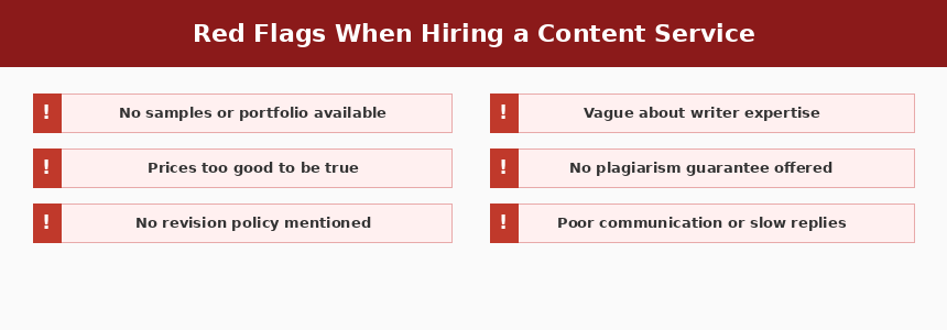 • Vague writer qualifications: If a service cannot tell you who is writing your content, what their background is, or how they were vetted, that is a red flag.