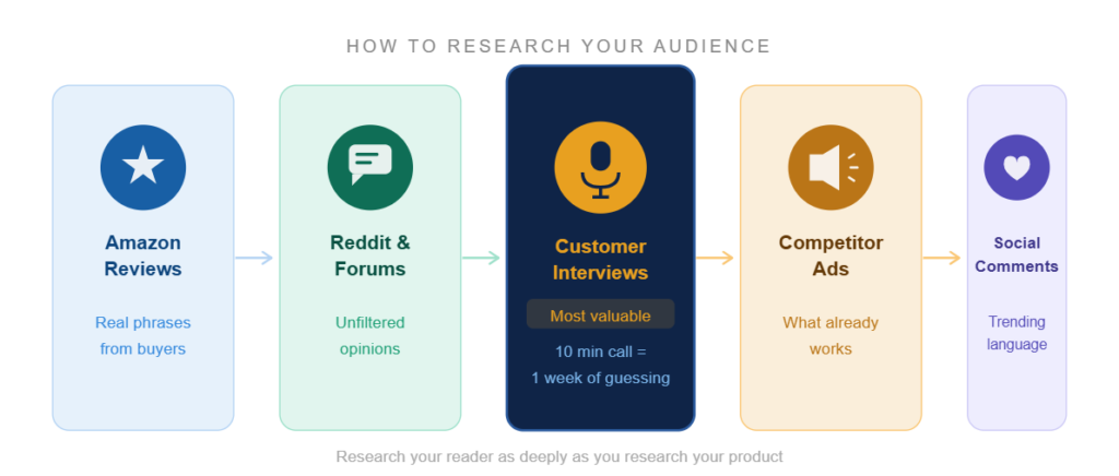I read customer reviews on Amazon for products in the same category. I look for the exact phrases people use to describe their frustrations and their wins. Those phrases go directly into my copy.