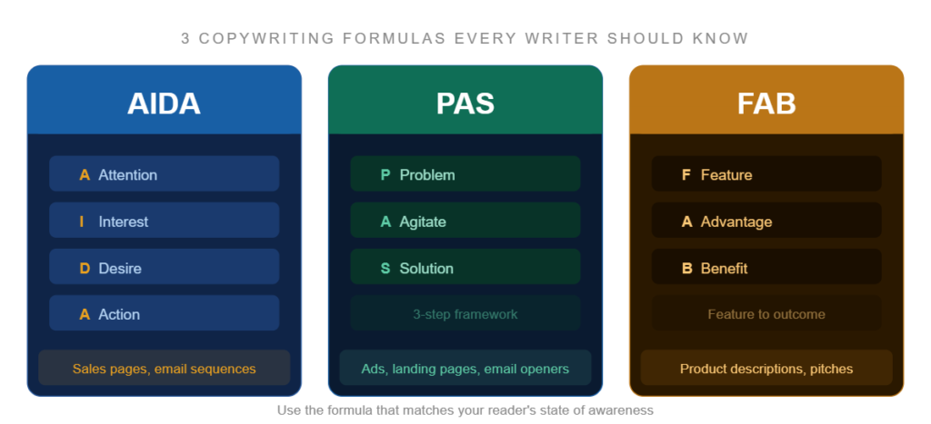 PAS stands for Problem, Agitate, Solution. I use this one more than AIDA these days because it connects emotionally before it sells.