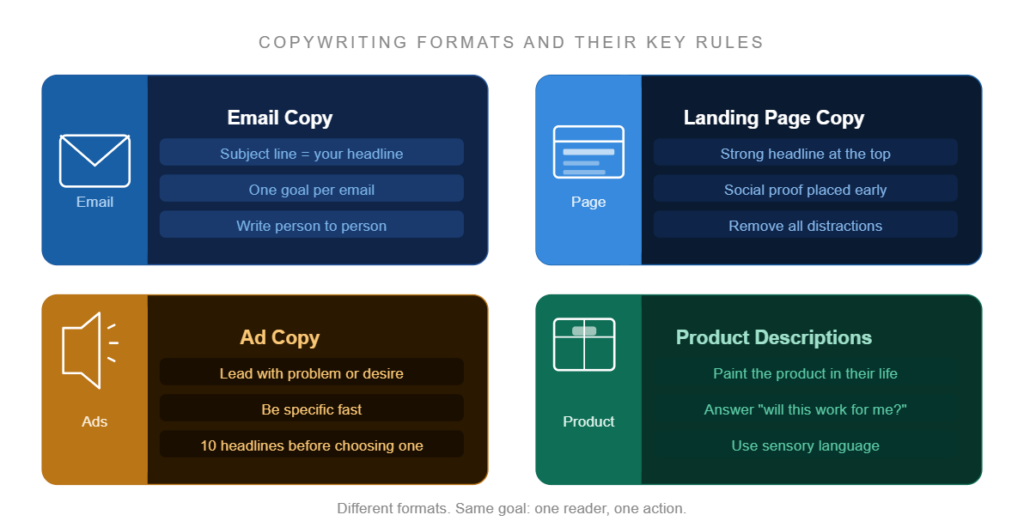 Copywriting is not a single skill. It is a cluster of related skills applied to different formats. Here is how I think about the most common ones.
