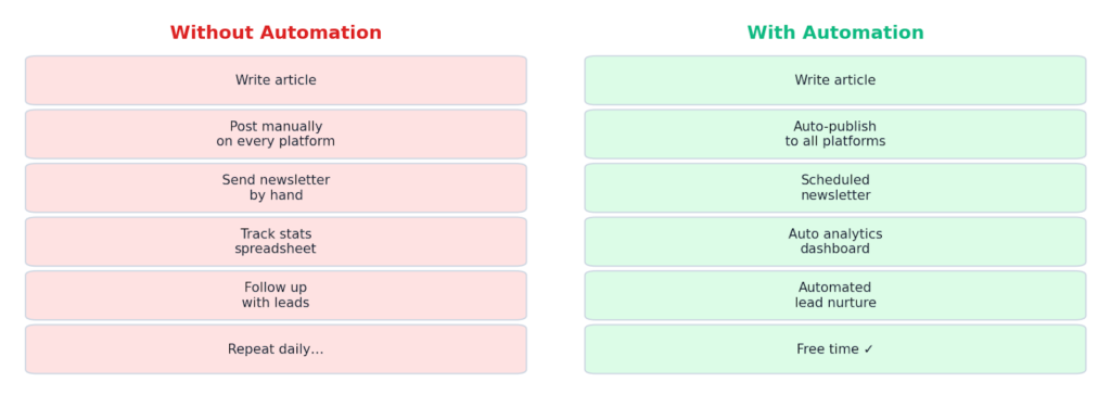 Say you write 4 articles a week. Each article needs to be shared on LinkedIn, Twitter, Facebook, and your newsletter. That is 4 tasks per article, times 4 articles, which adds up to 16 manual posting actions a week. Add in the time to check analytics, reply to automated sequences by hand, and manage leads, and you are easily burning 8 to 10 hours a week on distribution alone.