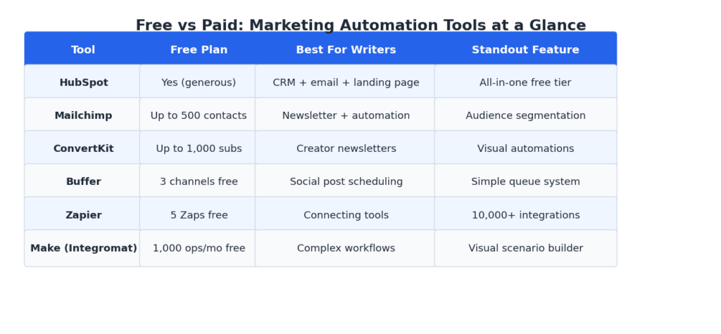 One of the best things about the marketing automation landscape in 2025 is how much you can do for free. Here is a complete free stack that covers the most important automation needs for a writer.