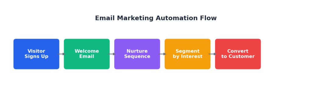 Email marketing automation means setting up a sequence of emails that go out automatically based on what a subscriber does. When someone joins your list, they get a welcome email. When they open that email and click a link, they get tagged as interested in that topic. When enough tags stack up, they get an offer that matches exactly what they care about.