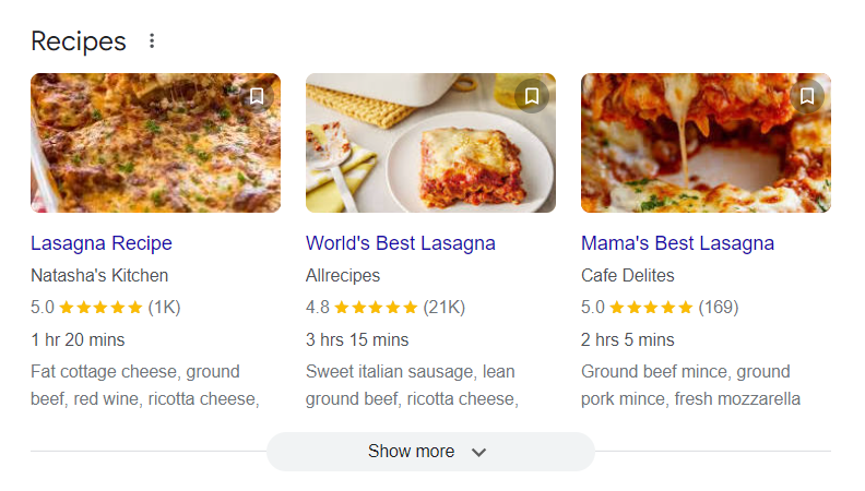 This type of markup allows you to provide search engines with all the details about your recipes, like the ingredients, cooking time, and nutritional information.