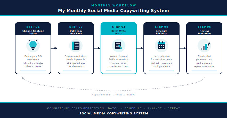 This approach keeps my creative energy high. Writing in flow state produces better social media copy than grinding out one post per day ever did.