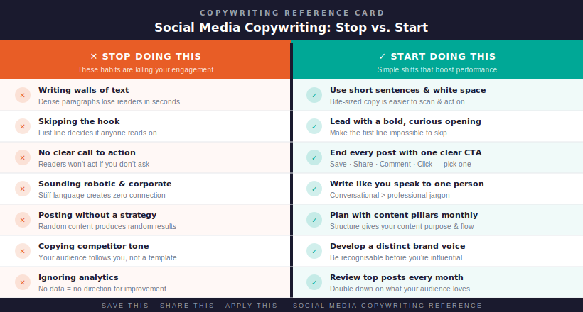 Good social media copywriting is fast, clear, and emotionally intelligent. It earns attention in the first line. It delivers value without wasting words. And it ends with a clear reason for the reader to do something, whether that is clicking, commenting, saving, or sharing.