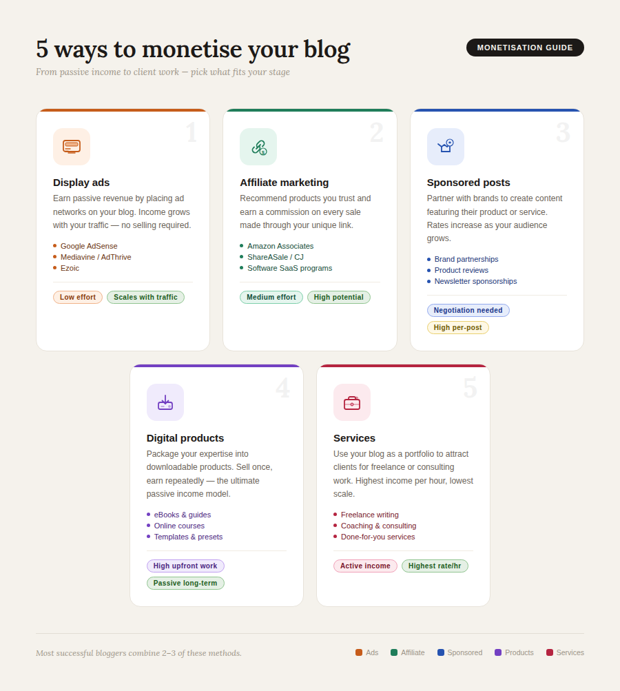 Ebooks, templates, courses, and printables. These are things you create once and sell repeatedly. This is where a lot of experienced bloggers make the bulk of their income.