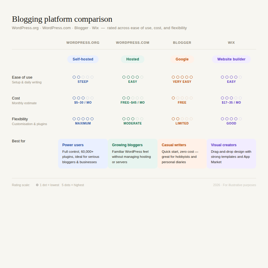 • WordPress.org: The most flexible option. You own everything. Requires a hosting plan and a little setup, but it gives you the most control long-term.