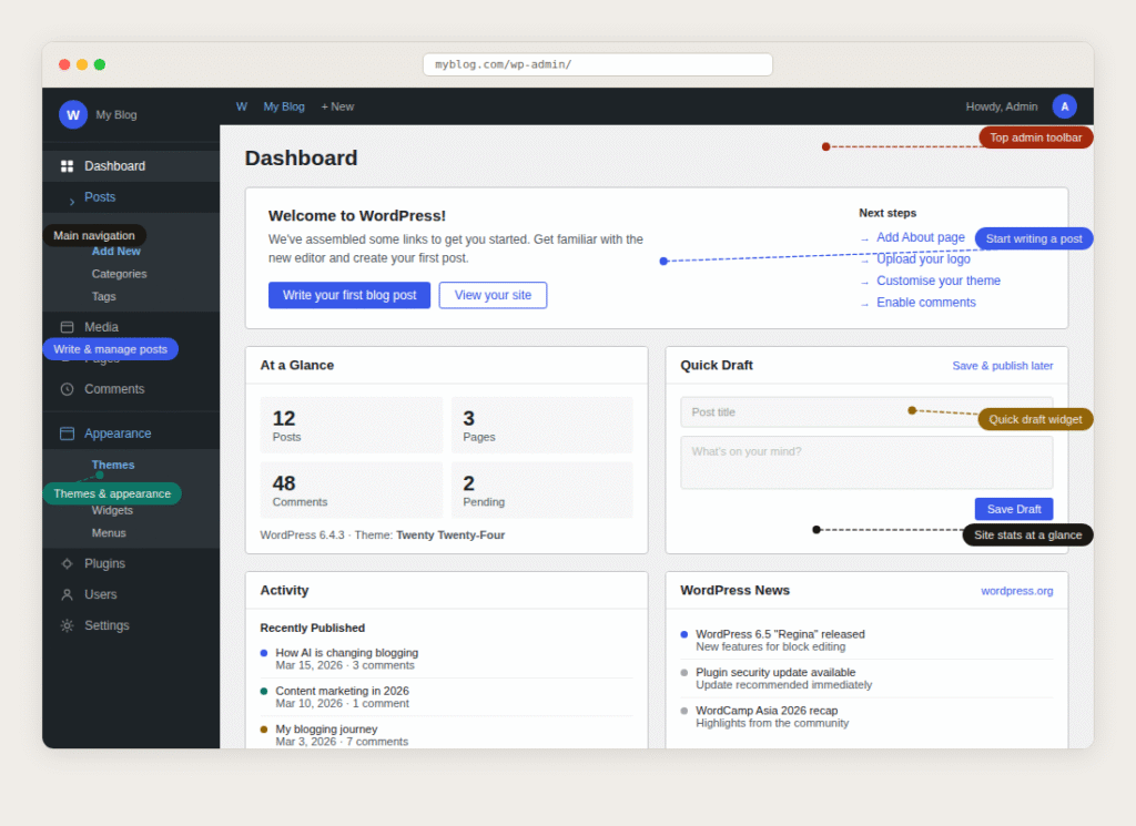Once you have hosting and a domain, the next step is installing WordPress and picking a theme. A theme controls how your blog looks.